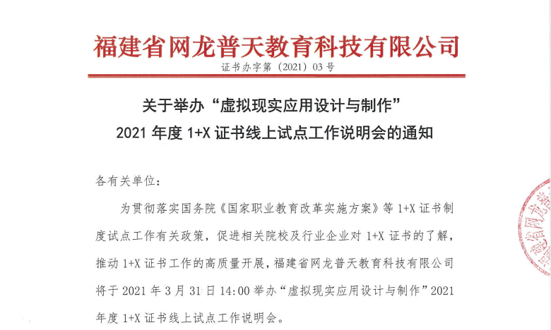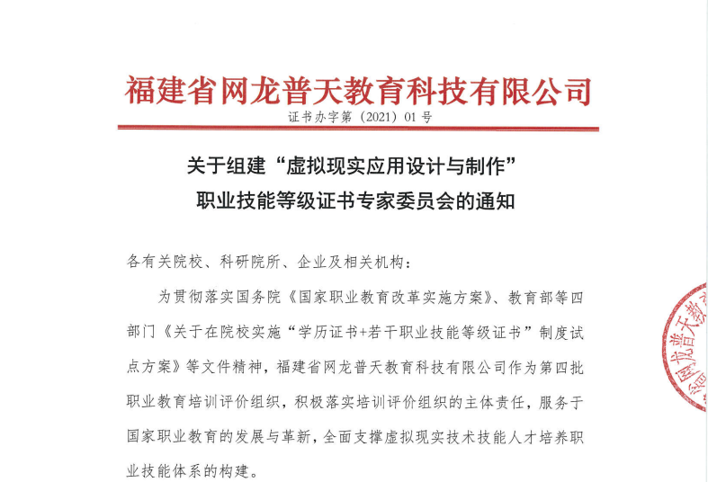 为深入贯彻《国家职业教育改革实施方案》精神,全面落实教育部办公厅、国家发展改革委办公厅、财政部办公厅三部门印发的《关于推进1+X证书制度试点工作的指导意见》(教职成厅函[2019]19号)要求,福建省网龙普天教育科技有限公司将开展2021年虚拟现实应用设计与制作职业技能等级证书考核站点遴选工作,现将有关事项通知如下: